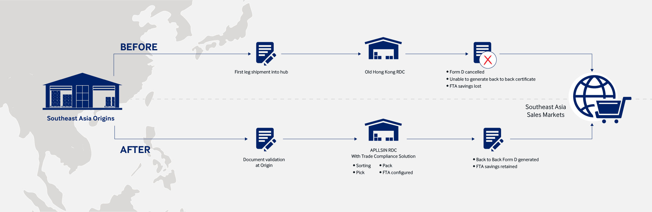 A large retailer in Southeast Asia was losing FTA savings because its products were passing through a non-FTA member hub where pick and pack operations were performed. They needed a solution to retain these savings, which were significant.
